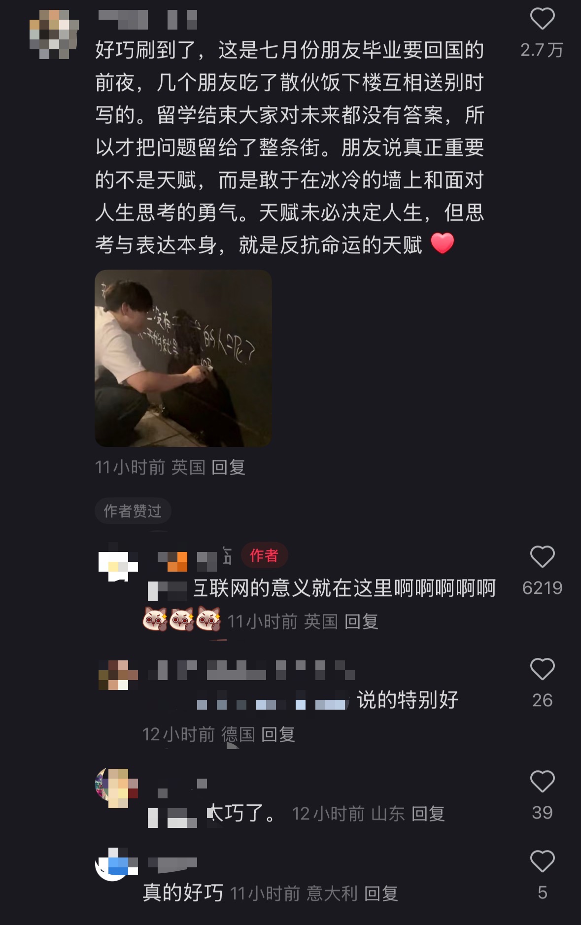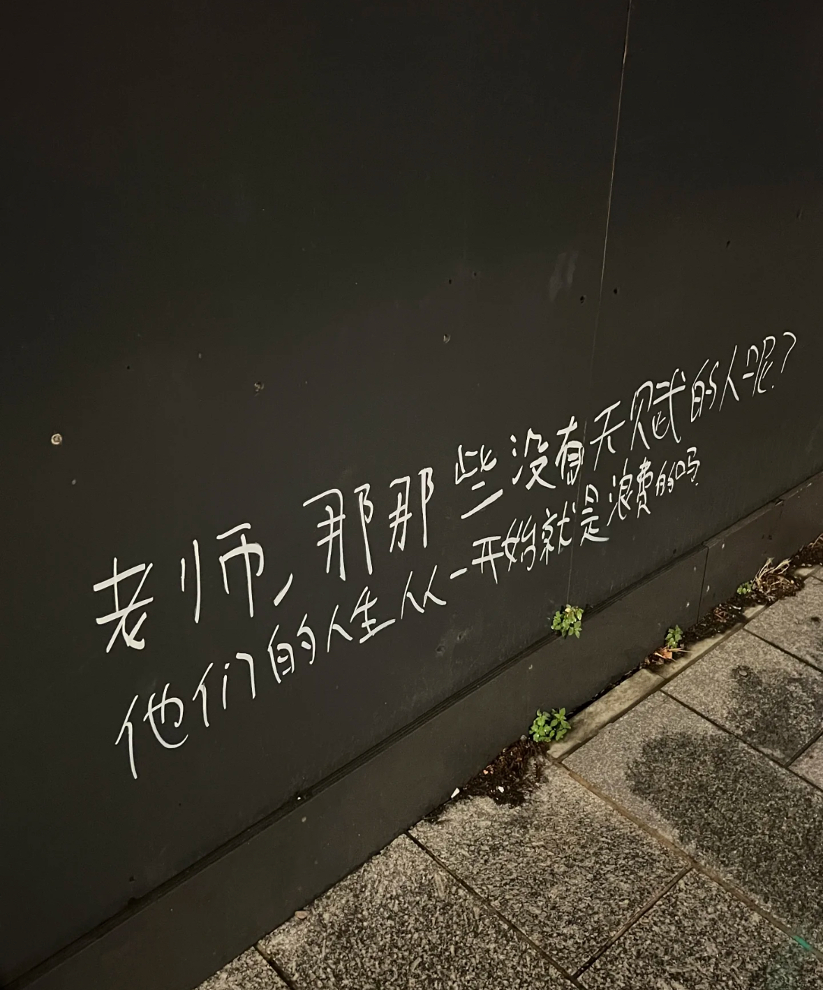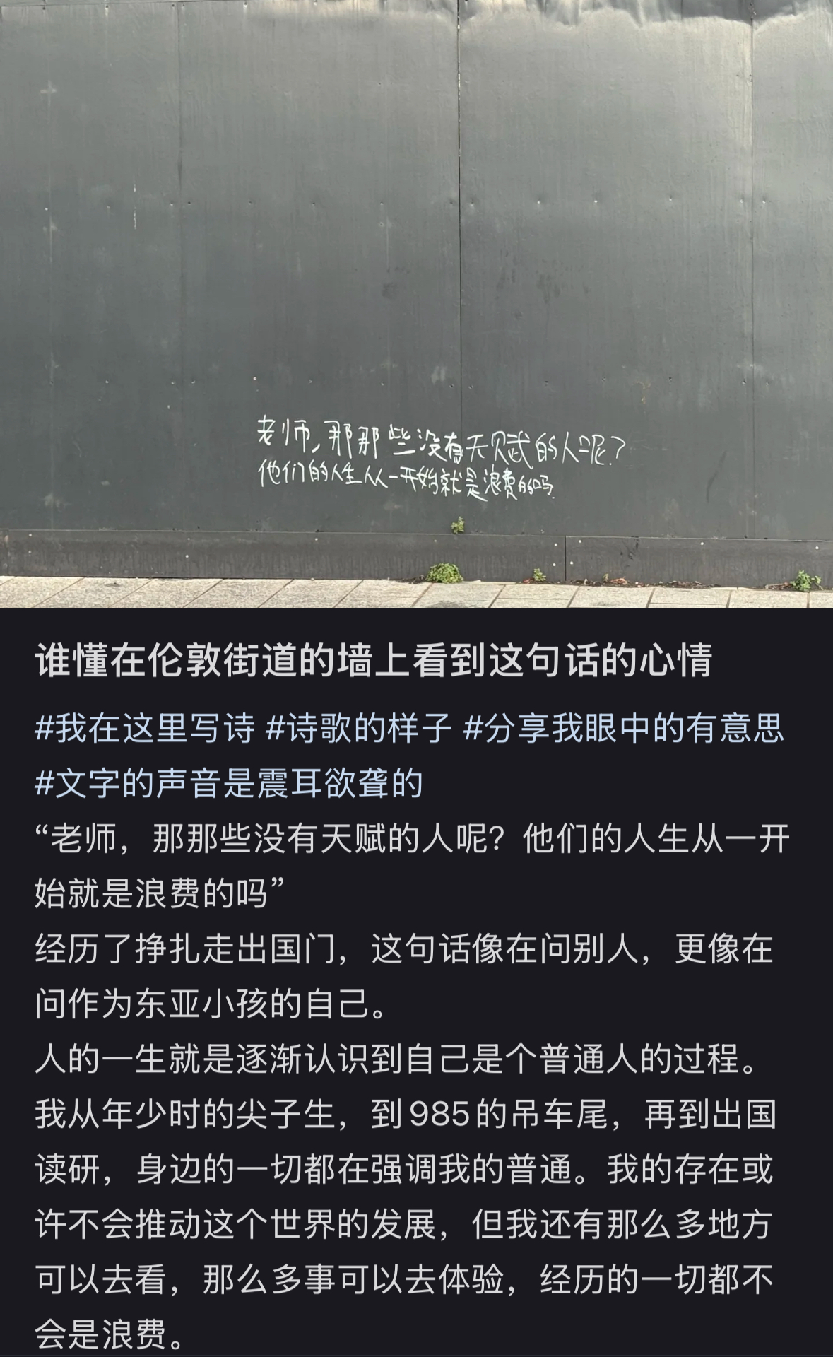 “老师,那些没有天赋的人呢?他们的人生从一开始就是浪费的吗?”9月29日,网友@小降临 在个人账号上传一张照片,并留言“谁懂在伦敦街道的墙上看到这句话的心情”。本是讲述自己在英国留学时,偶遇写在墙壁上的一段中文涂鸦,感慨自己的经历。没想到却意外收到了作者和朋友的亲自回复,还有许多网友的鼓励,让她深受鼓舞,不再自我怀疑。不少网友也纷纷留言,“这大概就是互联网的意义”。