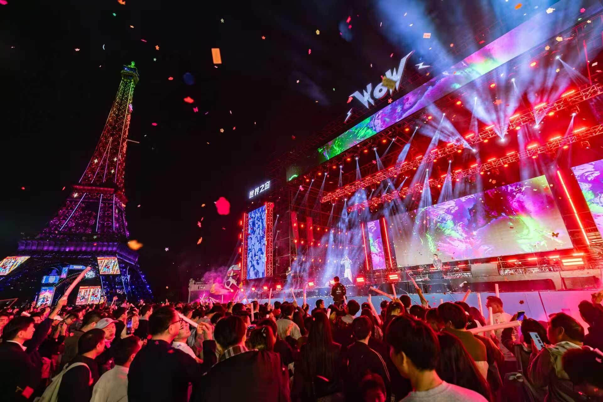 园区围绕“日欢聚、夜璀璨”主题打造多元体验。日场主打“欢笑热梗节”、“LOVE SHOW”全景剧场及“闪光偶像舞台”三大互动板块,融合热梗巡游、沉浸式观演与偶像零距离互动,吸引大量游客参与打卡。夜场则持续升级光影艺术与演艺体验。全新演艺《拿破仑传奇》在埃菲尔铁塔震撼上演,配合灯光秀与骑士对决场景,赢得观众阵阵喝彩;经典回归的《盛世纪》则以舞美叙事展现中华五千年文明。同时,“爱意气球雨”、“飘雪电音盛宴”及每晚的高空无人机大秀,为夜色增添浪漫与科技交融的节日氛围。